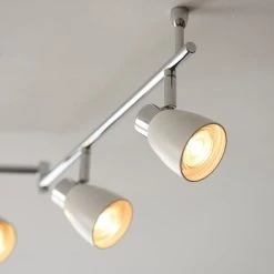 Light up your room with the stylish Alto 6 Light Chrome Spotlight Bar, the perfect addition for adding a modern contemporary feel to your home. This modern light fitting features matt white shades with adjustable heads to allow for optimum direction of light and a chrome finish on the base and bar, the folding bar allows for greater adjustment options. This spotlight bar is dimmable, with matching family items available to help coordinate your home.