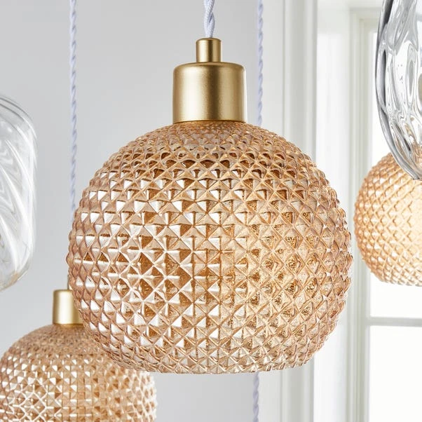 Featuring gold printed details and white twisted cables, the Elodie Cluster Ceiling Fitting has a variety of glass shades that can be varied in height to suit your personal preference. The light features 3 x amber round glass shades, 3 x clear lozenge glass shades and 2 x smoke dimpled cylinder glass shades. 8 x SES/E14 Candle bulbs are required to be purchased in conjunction with the Elodie Cluster Ceiling Light. Fully dimmable compatible with a suitable bulb and light switch. Matching family items are available in the Elodie range.