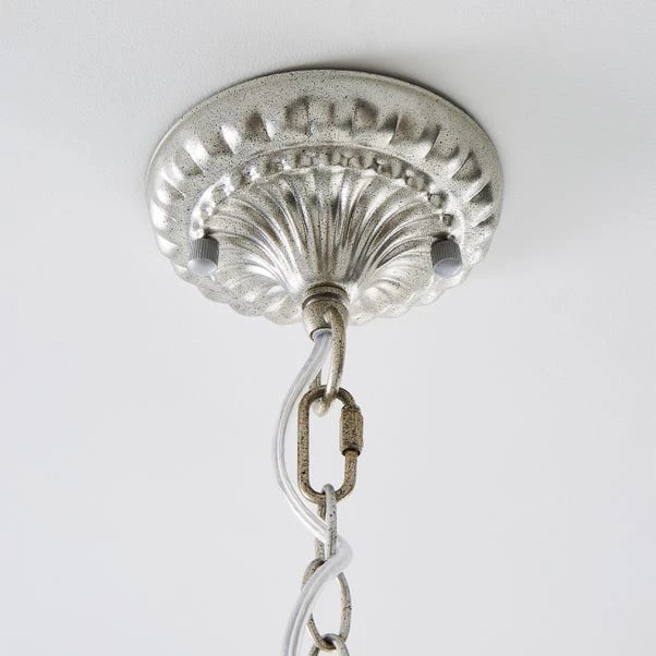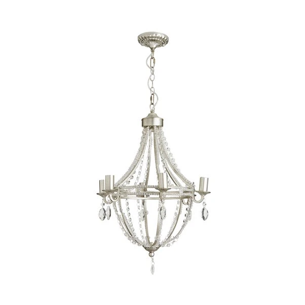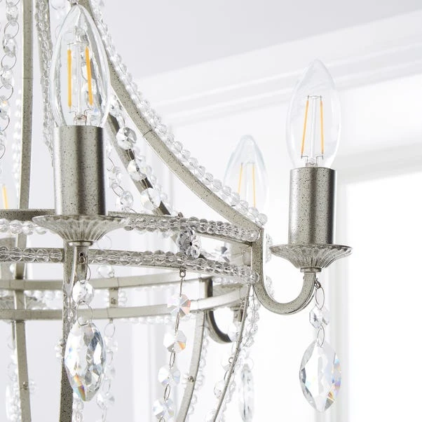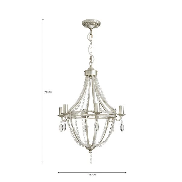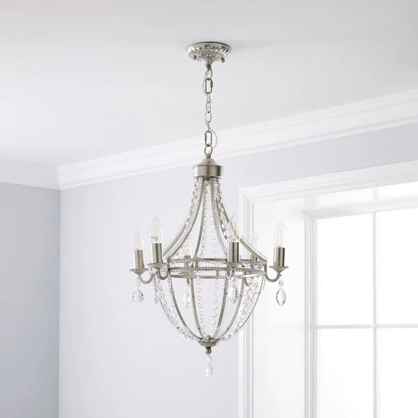 Elegant and timeless, the Eugenie 6 light chandelier would bring an opulent and sophisticated feel to any living or bedroom space. This stunning light fitting features a stunning antique silver finish, complete with a height adjustable chain suspension, decorative base, and an acrylic crystal detailing for a truly elegant look.