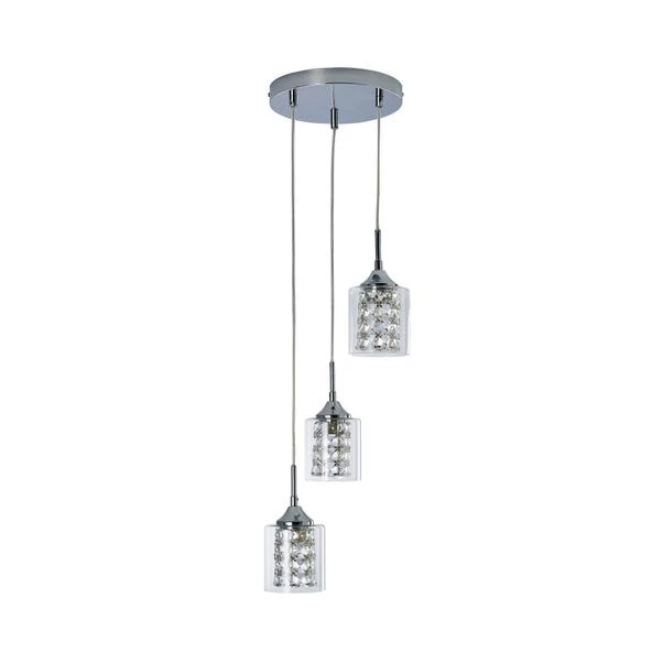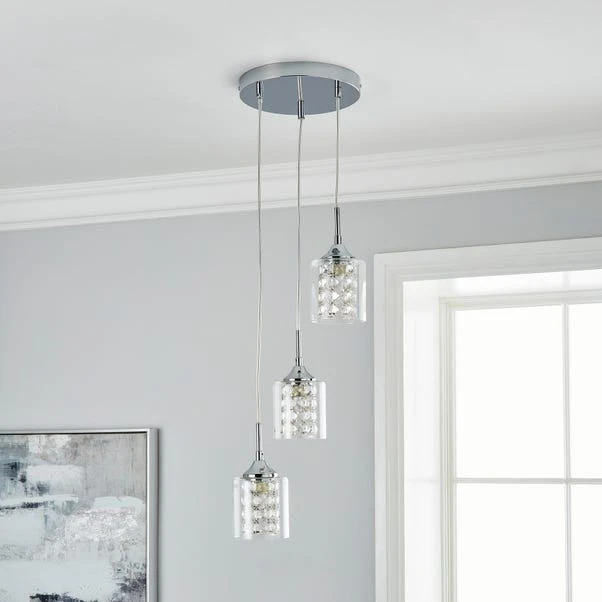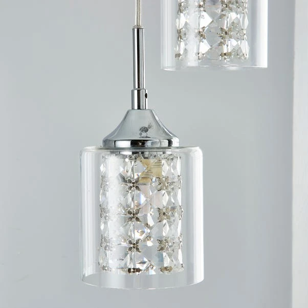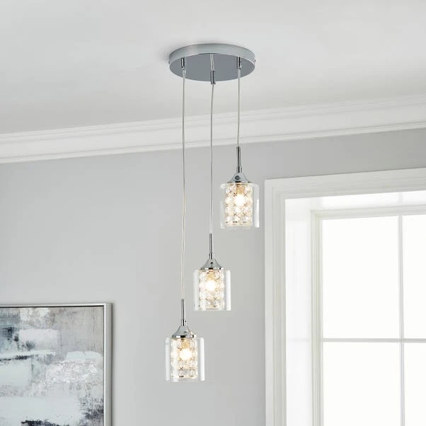 Add a luxurious look to your décor with the Frankie 3 Light Cluster Ceiling Fitting, beautifully designed with a chrome base and three crystal shades enclosed within clear glass shades. This contemporary style light features 3 height adjustable clear flex cables, allowing you to collapse or extend the shades to create a unique look to better suit your space. Matching family items available to help coordinate your home.