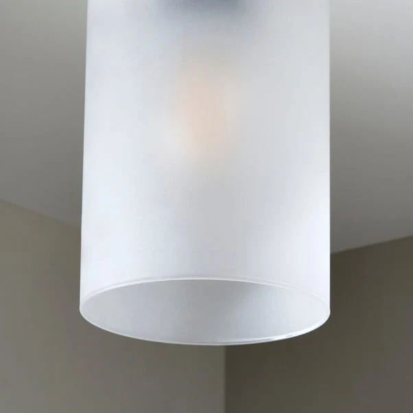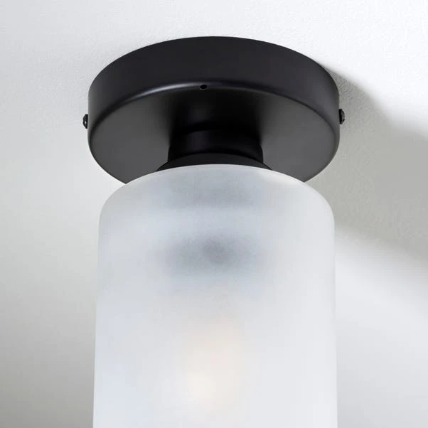 - One light Flush with a frosted glass shade and matt black plate
