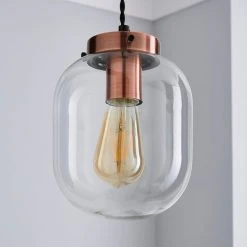 This ceiling fitting is the perfect piece to accompany and add a touch of style to any room of the house, with a brushed copper finish and clear glass shade that will complement an array of home decors. With an industrial look, the height can be adjusted to suit your taste. The light is compatible with dimmer lights and matching family items are also available.