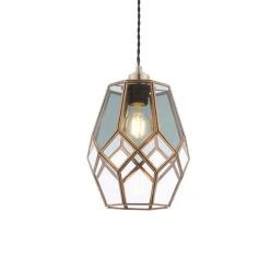 This stunning glass cage pendant would bring a classy look to any space, featuring clear and grey glass panels, finished with an antique brass effect trim. This piece is compatible with LED lamps.