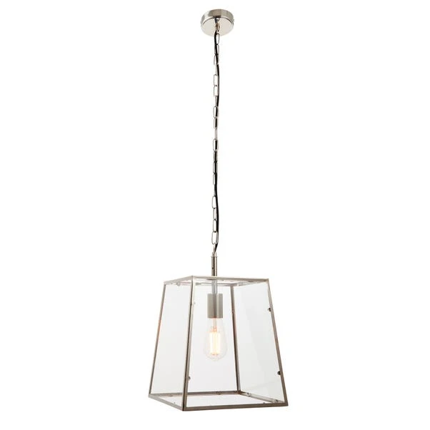 Inspired by box lanterns, the authentic and timeless Idabel Pendant fitting is the perfect compliment for today’s relaxed classic interiors. This stunning fitting is finished in bright nickel and suspended from a fully height adjustable chain with black fabric flex. This piece is perfect for pairing with vintage style filament LED bulbs, perfectly framing them within the subtle metalwork frame and large clear glass panels.