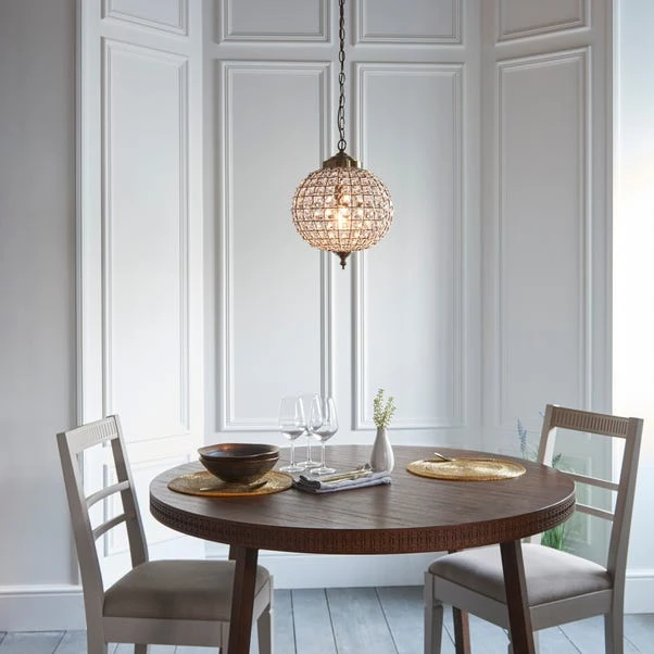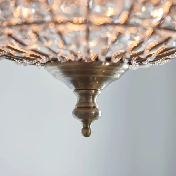 Boasting a stylish retro design, the Lelia Pendant fitting features a dome shaped cage shade suspended by a decorative chain, all in an antique brass finish with delicate clear glass bead details. This light fitting is also height adjustable at time of fitting, making it suitable for a range of spaces.