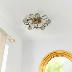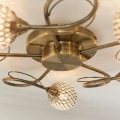 The 5 light flush Malden light fitting finished in a gorgeous antique brass will add style to any room. This low-profile light fitting features stylish swirled arms, capped by mesh shades encrusted with clear glass beads. Suitable for use with LED G9 lamps.