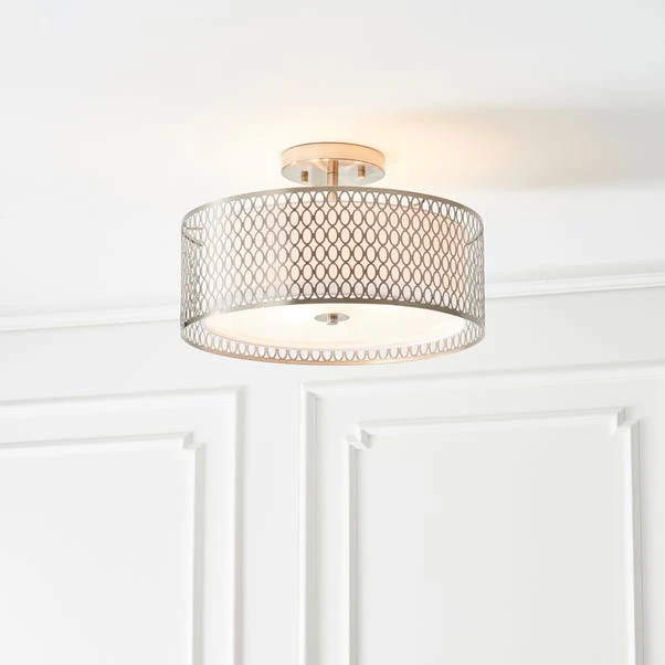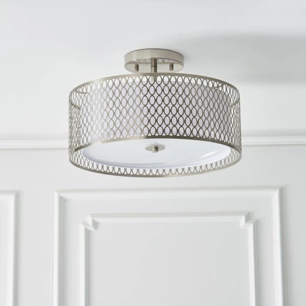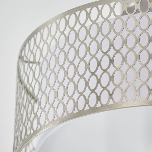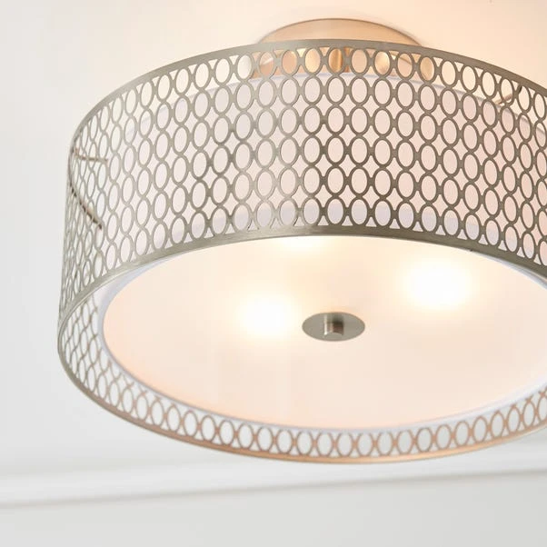 The stunning Vogue Tolna 3 Light flush ceiling light features a classic circular design with a trendy geometric fretwork, finished with an inner fabric shade for lovely light diffusion. This modern design is dimmable and perfect for low ceilings.